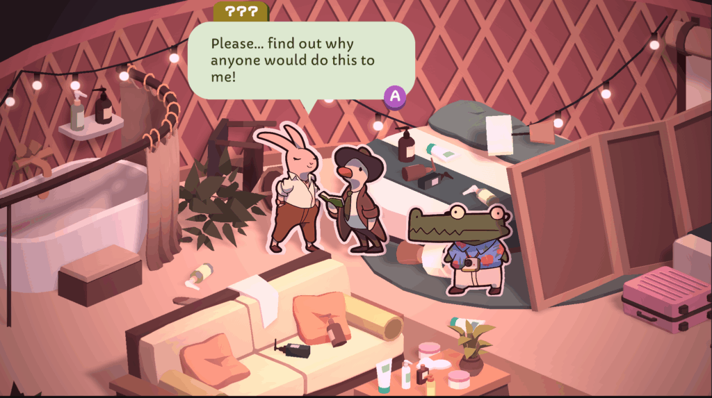 SO ein Detektiv unterhält sich viel, sammelt Hinweise und kombiniert die erhaltenen Informationen in seinem Notizbuch. So kommt man nach und nach der Lösung des Falls näher. Die Ente steuern wir per Mausklick am PC oder durch Bildschirmberührung am Tablet und Smartphone. Wer will kann aber auch einen Controller verwenden. Der kommt auch zum Einsatz, wenn man auf dem Steam-Deck (oder einem anderen PC-Handheld) spielt. Nicht unerwähnt bleiben sollte die eine Taste, mit der man Eugene McQuacklin zum quaken bringt. Ich konnte es mir nicht verkneifen davon regelmäßig Gebrauch zu lassen, was mir immer ein kleines Lächeln entlocken konnte. Tatsächlich wir der Gag nicht alt.