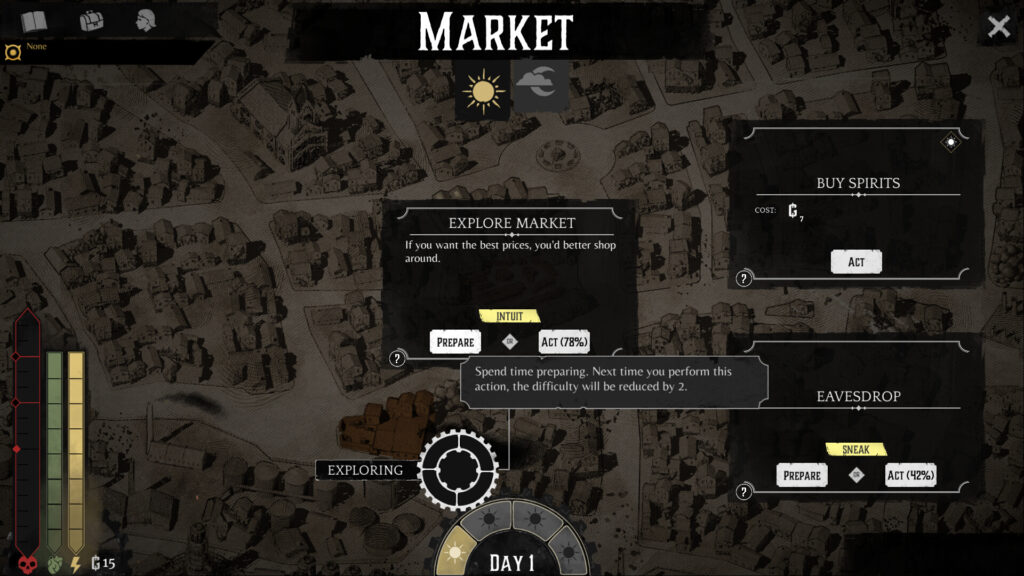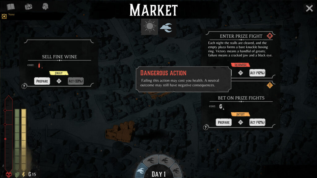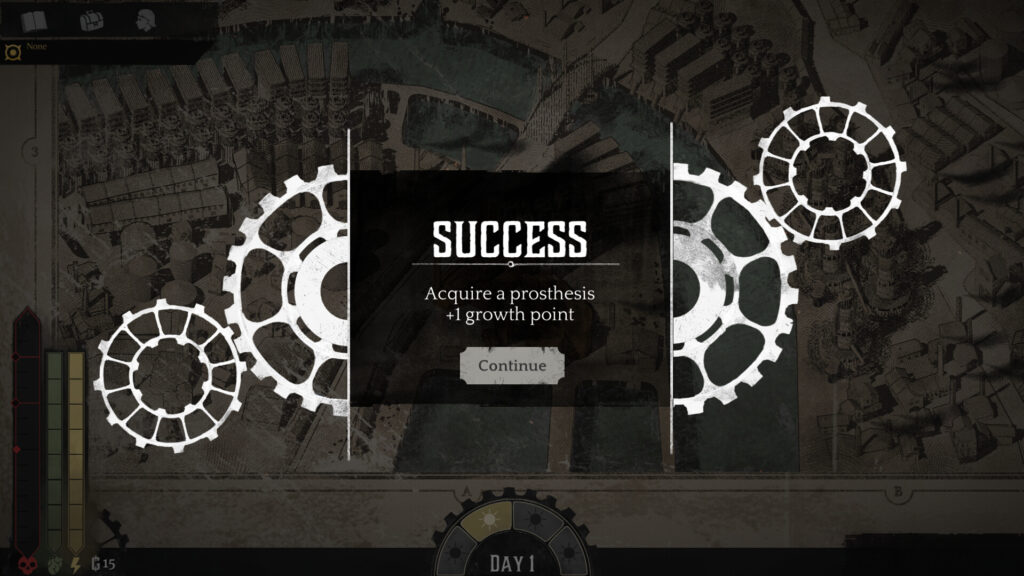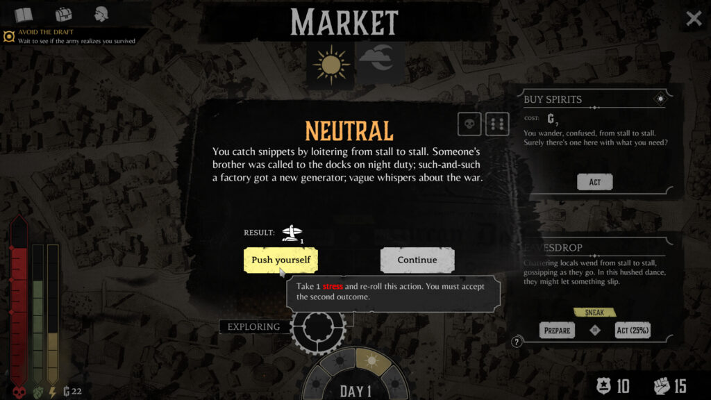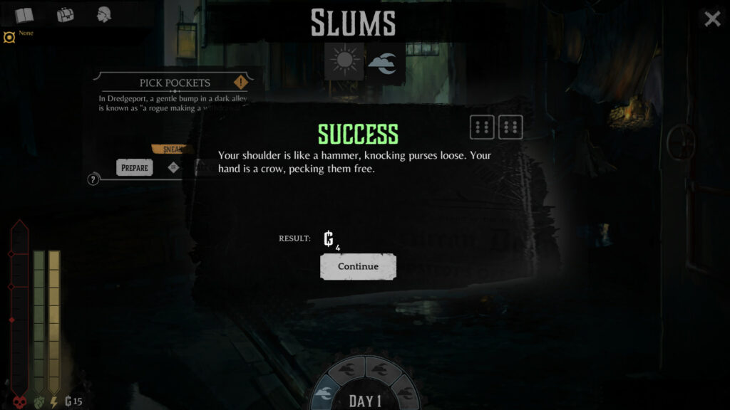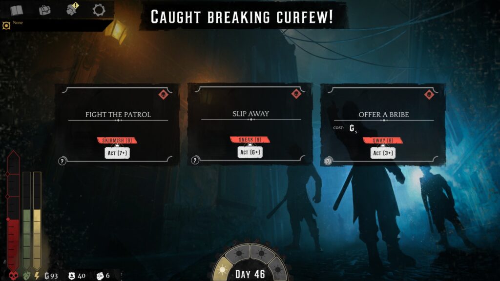 So spielt sich Duskpunk immer ein wenig anders. Auch sind ein paar Ereignisse zufallsbedingt, was ebenfalls den Wiederspielwert erhöht. Aktionen, die man im Text auswählt, führen die Story immer weiter. Ereignisse auf der Karte werden dagegen wie in einem TTRPG (Table Top Role Playing Game) immer ausgewürfelt. Das Auskommen beeinflusst man durch seine Charakterwerte und erhöht seine Chance mit Vorbereitung. Letzteres kostet aber Zeit und ist manchmal dann nicht möglich.