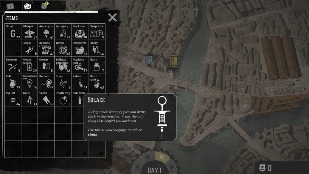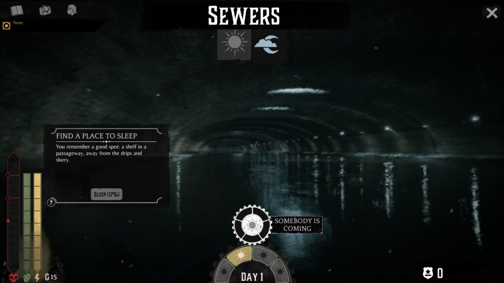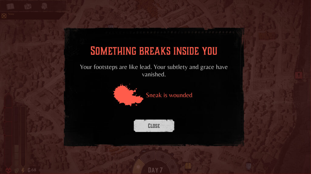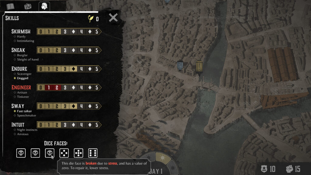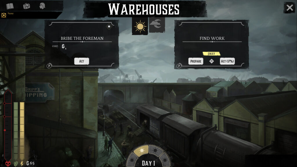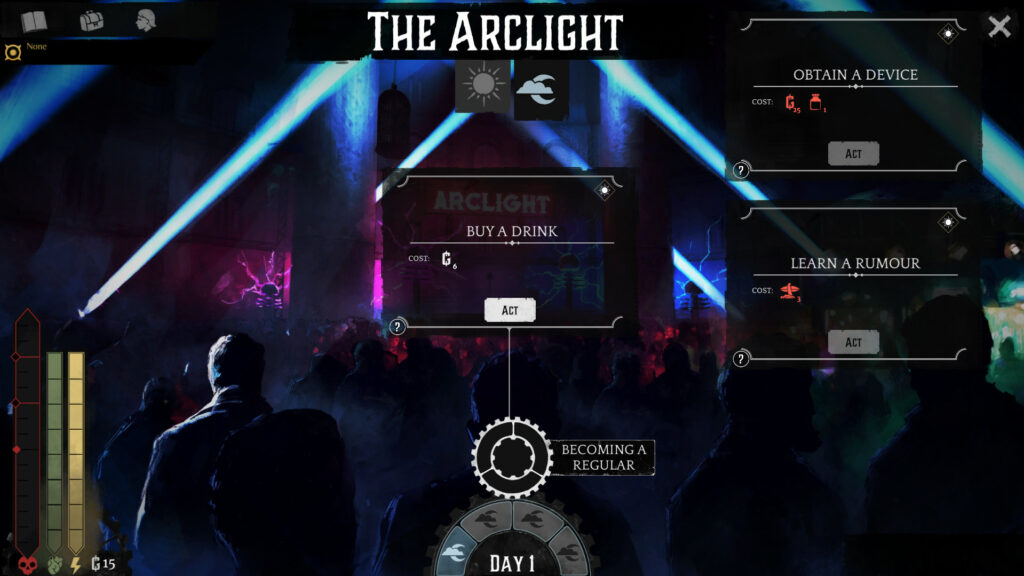 So spielt sich Duskpunk immer ein wenig anders. Auch sind ein paar Ereignisse zufallsbedingt, was ebenfalls den Wiederspielwert erhöht. Aktionen, die man im Text auswählt, führen die Story immer weiter. Ereignisse auf der Karte werden dagegen wie in einem TTRPG (Table Top Role Playing Game) immer ausgewürfelt. Das Auskommen beeinflusst man durch seine Charakterwerte und erhöht seine Chance mit Vorbereitung. Letzteres kostet aber Zeit und ist manchmal dann nicht möglich.
