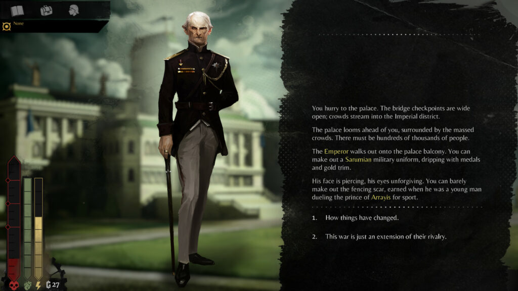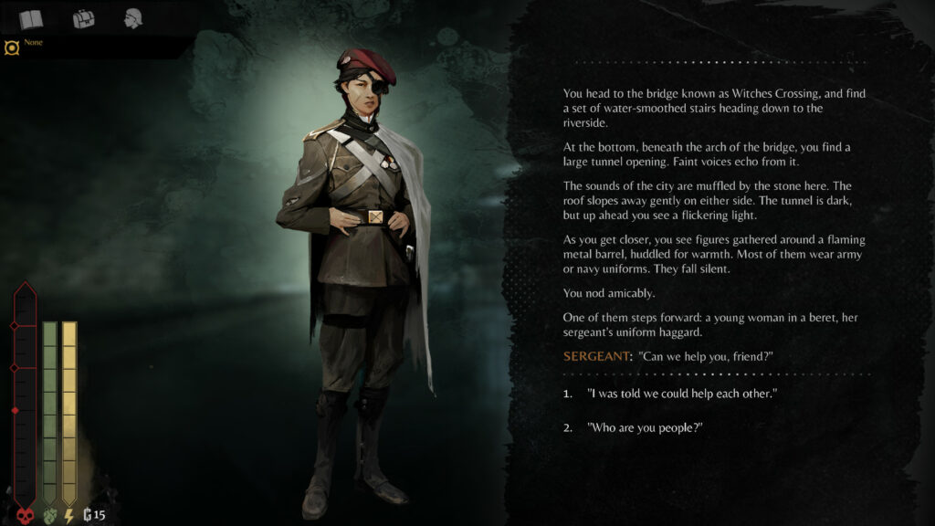 Doch kommen wir endlich zum eigentlichen Spiel. In Duskpunk geht es um die Schrecken des Krieges, denen unser Protagonist entkommen möchte. Und auch wenn das in einer fiktiven Welt spielt, wird man unweigerlich auch Parallelen zum Krieg in der Ukraine und im Nahen Posten ziehen. Es ist also definitiv keine leichte Kost und gehört von Kindern ferngehalten, denn es ist auch in einigen Darstellungen sehr explizit. Beim Spielstart bestimmen wir den Hintergrund unseres Charakters und wie er angesprochen wird. Auch dürfen wir ihm einen Namen geben. Mit unserem Hintergrund bestimmen wir auch unsere Erfahrungen, die bei Aktionen über Gelingen und Scheitern entscheiden können.