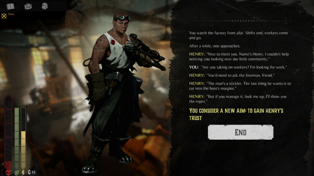 Laut dem Solo-Entwickler James Patton handelt es sich bei seinem Spiel Duskpunk um ein erzählerisches Rollenspiel. Sorry, aber wenn man sich ein paar Elemente aus einem Rollenspiel leiht, macht dass noch lange keine solches. Duskpunk ist ein bebildertes Text-Adventure. Der Stil erinnert einen an Disco Elysium und Citizen Sleeper. Letzteres gibt der Entwickler auch als Inspiration an.