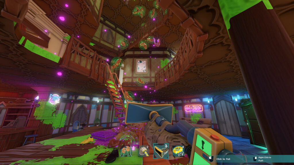 Zu allem Überfluss hat das Spiel auch arge technische Mängel. So stürzte die Vorabversion bei uns regelmäßig ab, fror ein oder überschrieb beim Update die Spielstände. Daraufhin haben wir das Spiel eine ganze Weile ruhen lassen und jetzt nochmal installiert. Inzwischen ist es ja auch offiziell erhältlich, da sollten sich die meisten technischen Mängel erledigt haben. Ja und nein. Zwar läuft es nun deutlich stabiler und unsere Spielstände funktionieren auch nach einen Update, aber es gibt immer noch regelmäßige Performance-Einbrüche, die wir nicht nachvollziehen können. Ansonsten ist as was man da geboten bekommt, aber schon okay. Die Grafik ist nett und extrem bunt, die Geräusche passabel und die Steuerung mit dem Controller funktioniert gut. Monster Mop Up ist nur in Englisch vertont, bietet aber immerhin deutsche Texte aus dem Übersetzungsautomaten, die teilweise derbe Rechtsschreibfehler aufweisen. Da hätte man wirklich wenigstens mal drüber lesen können…