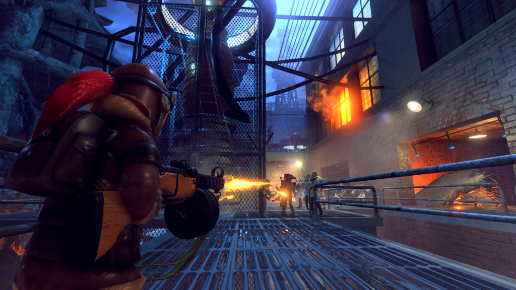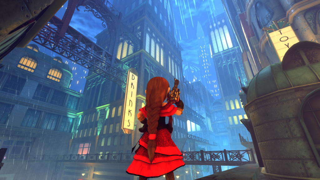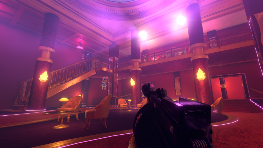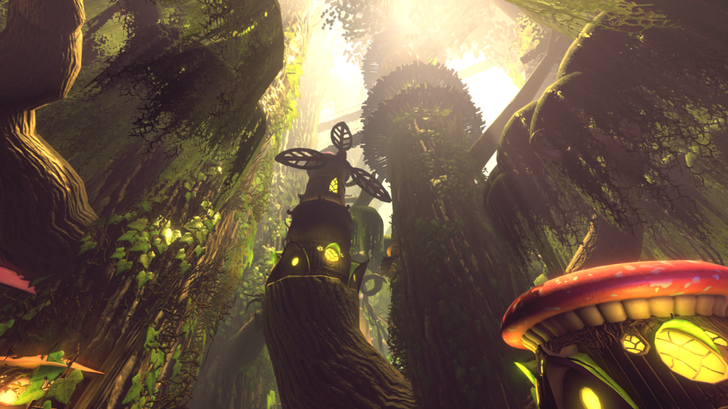 Abgedreht ist übrigens nicht nur die Welt, sondern auch die Ausrüstung der Kleinen. Ich plädiere für die Einführung des rosa Regenschirms in allen zukünftigen Ballerspielen. Okay, es gibt auch jede Menge Schießgerät. Und ein Einhorn, erwähnte ich schon das Einhorn! Onirism bietet uns Action in kleinen Dosen und lässt uns dazwischen immer wieder verschnaufen und mal die Welt genießen. Dann müssen wir aber nicht nur erkunden, sondern meist auch das eine oder andere Rätsel lösen. Die sind meistens relativ einfach und mit etwas Grips auch machbar. Ein, zwei Rätsel hatte ich aber, bei denen sich mir die Lösung nicht sofort erschlossen hat. Dann habe ich eine Pause eingelegt und später weitergespielt, was mir die Erleuchtung und die Lösung des Rätsel brachte.