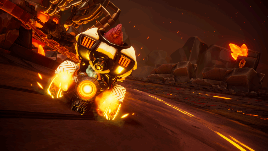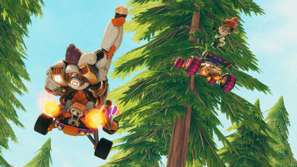 Die Fahrzeuge sind ziemlich abgedreht und sehen somit ihren Fahrern in nichts nach. Die optische Vielfalt wirkt sich aber spielerisch kaum aus, denn außer kleinen Unterschiede bei Beschleunigung und Kurvenverhalten steuern sie sich doch alle sehr ähnlich. Das muss auch so sein, denn sonst wäre kaum ein fairer Wettkampf möglich. Den konnte ich allerdings nur online ausprobieren, denn zeitlich ergab sich keine lokale Testmöglichkeit mit Freunden. Dabei wurde ich aber angenehm überrascht, denn alle Matches mit Freunden liefen fair bis zum Ende. Spielverderber, die vorzeitig abgebrochen haben, weil sie am verlieren waren, gab es keine. Mag vielleicht daran liegen, dass ich oft das Schlusslicht war…